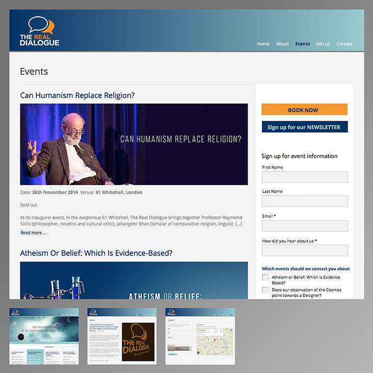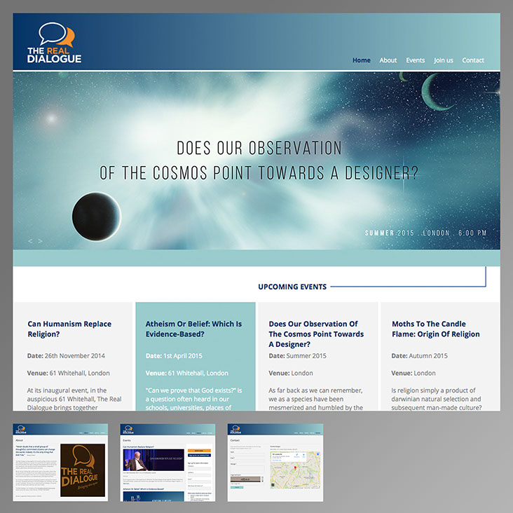 The Real Dialogue brings together the world’s leading thinkers to examine life’s deepest questions, in pursuit of a world free from dogma, prejudice and irrational belief. Work for this client included website design & development with complete marketing campaign for print and online media.