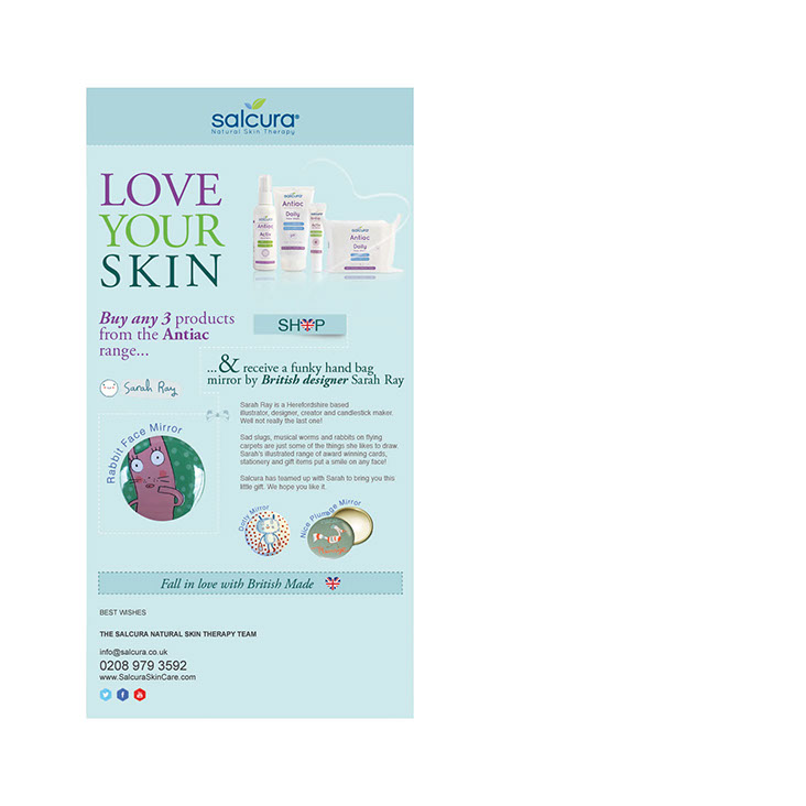 Salcura is a British skincare therapy brand based in Hamptons, United Kingdom. Work at Salcura includes product packaging design, print/online advertisements/email newsletters/company docs/social media campaigns and photography.