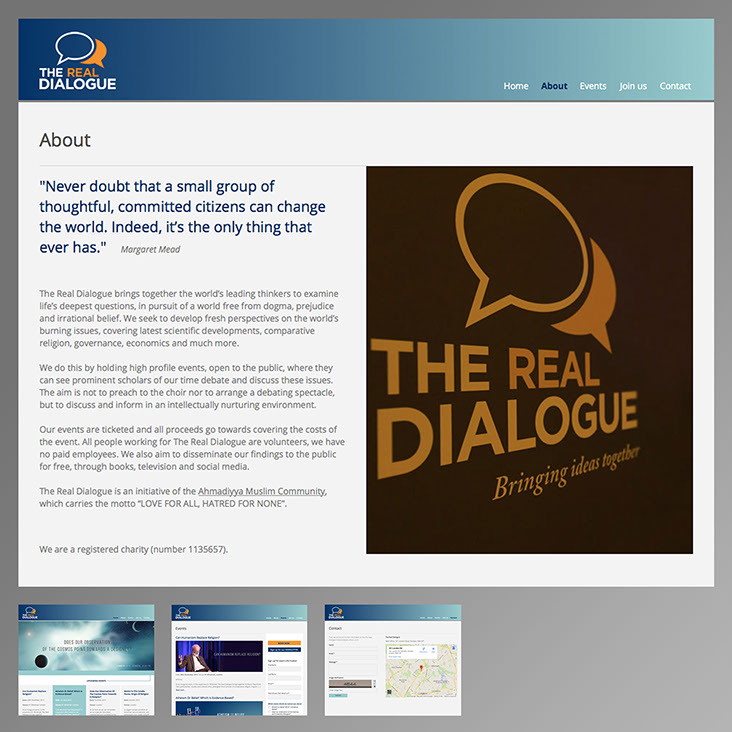 The Real Dialogue brings together the world’s leading thinkers to examine life’s deepest questions, in pursuit of a world free from dogma, prejudice and irrational belief. Work for this client included website design & development with complete marketing campaign for print and online media.